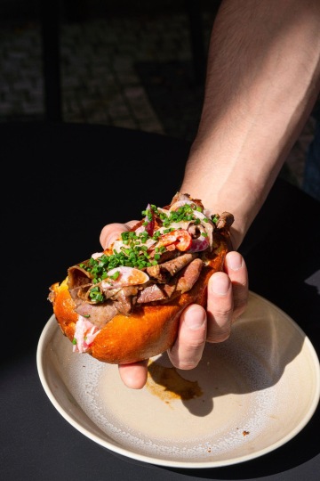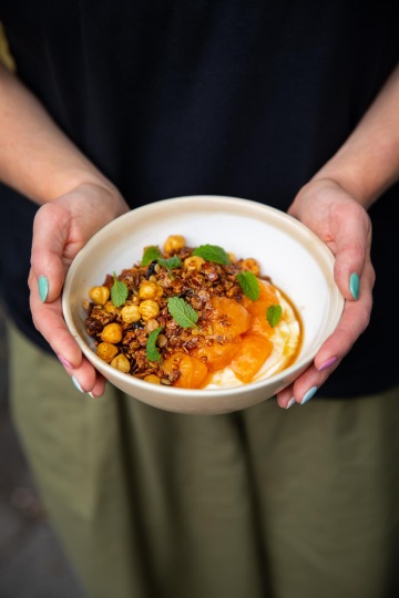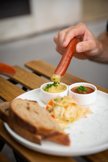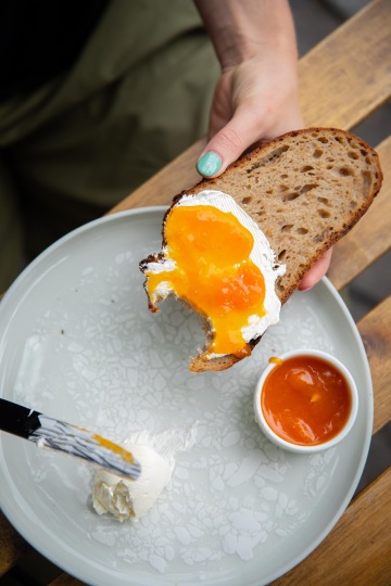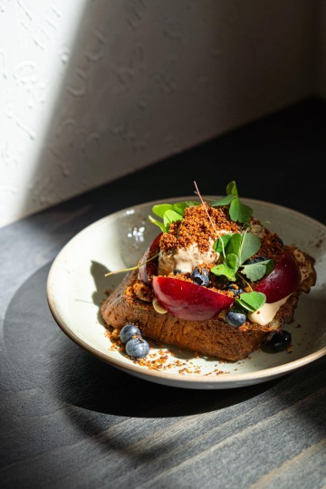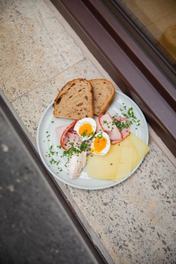 Základem je sladká (chléb, šlehané máslo, meruňková marmeláda) nebo slaná snídaně (chléb, šlehané máslo se sušenými rajčaty, sýr od Skály, šunka od Dolejších, vejce). Na snídaňovém menu nesmí chybět párky, které nově bereme od pana Heřmana. Kdo chce začít den bez masa, má na výběr mezi grilovanou brokolicí s holandskou omáčkou nebo tempehem s celerovým pyré. Sladkou snídani doplňuje ještě granola s jogurtem a kompotem z blum a rýžová kaše s broskvemi, lemon curd a pekany.