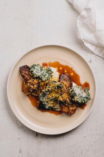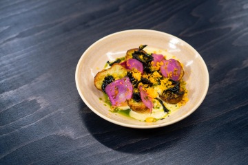 Hovězí jsme po křenové a houbové omáčce připravili se smetanovou omáčkou z kořenové zeleniny, brusinek, šípků a jablek. Stejně jako předchozí varianty se i tato servíruje ze šlehačkové láhve ve formě espumy. Jako příloha podáváme další novinku, špecle opražené na slaninovém tuku. Také jsme přidali nový předkrm, který doplní dva stávající, a to kuřecí paličky dochucené marinádou z kimchi a podávané s domácím krémovým sýrem labneh a bylinkami. Zbývá představit nový vegetariánský speciál – pečený topinambur se spálenou smetanou, sušeným stročkem, žloutkem s citronovou kůrou a pažitkou.