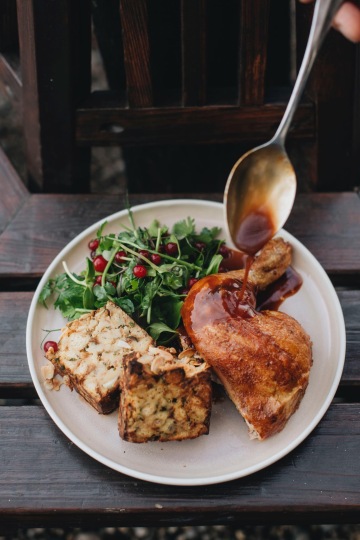 Kromě bůčku jsme přidali ještě další dva pokrmy: čtvrtku kuřete se šípkovou omáčkou, mandlovou nádivkou a bylinkovým salátem a kuřecí Waldorf sendvič se salátem, jablky, řapíkatým celerem a hrozny.