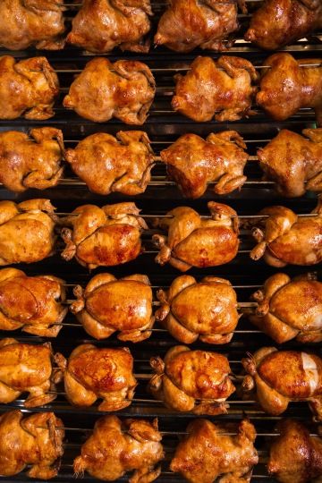 Taky jste tak milovali grilovaná kuřata ze stánku? Ta nezapomenutelná specifická vůně, promaštěný pytlík, marináda barvící prsty... V KRO na Vinohradské tuhle ikonu českých (nejen) devadesátek servírujeme ve verzi bez kompromisů, zato s maximem chuti: z kuřat z farmy Druhaz, den předem naložených v naší vlastní ultra-umami kořenící směsi z fermentované cibule, feferonek a bylinek, a pak pomalu pečených v rotisserii.